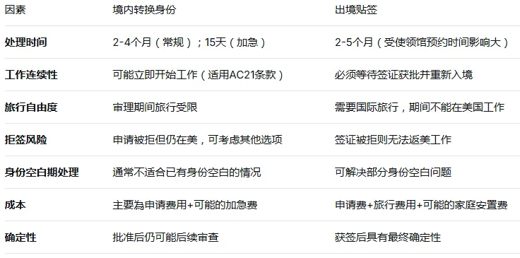 在美国跳槽期间处理工作签证是一个需要精心策划和谨慎执行的过程。境内转换身份提供了连续性和便利性,而出境贴签提供了最终确定性和解决特殊情况的可能。