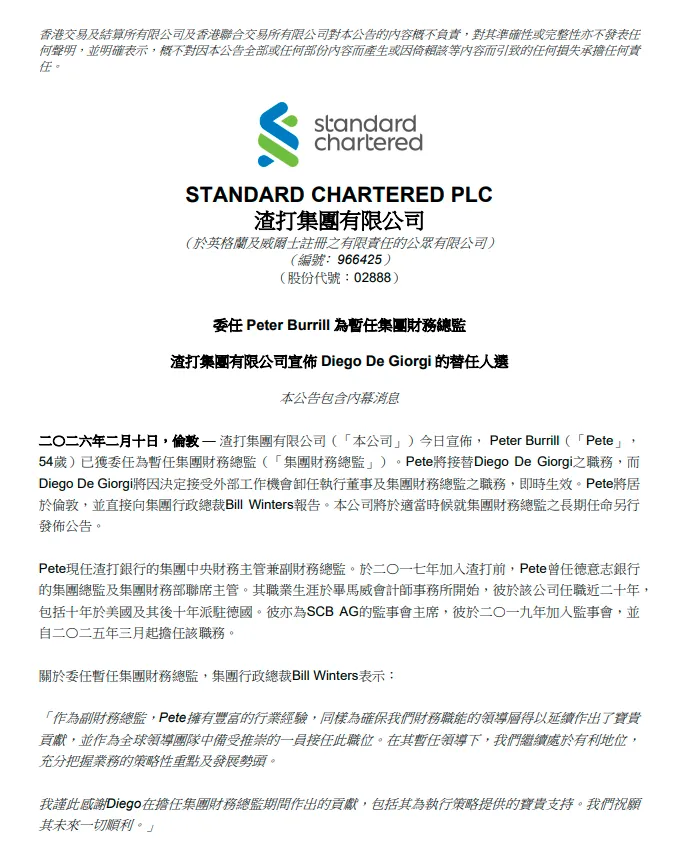 Peter Burrill已获委任为暂任集团财务总监,其将直接向集团行政总裁Bill Winters报告。公司将于适当时候就集团财务总监之长期任命另行发布公告。
