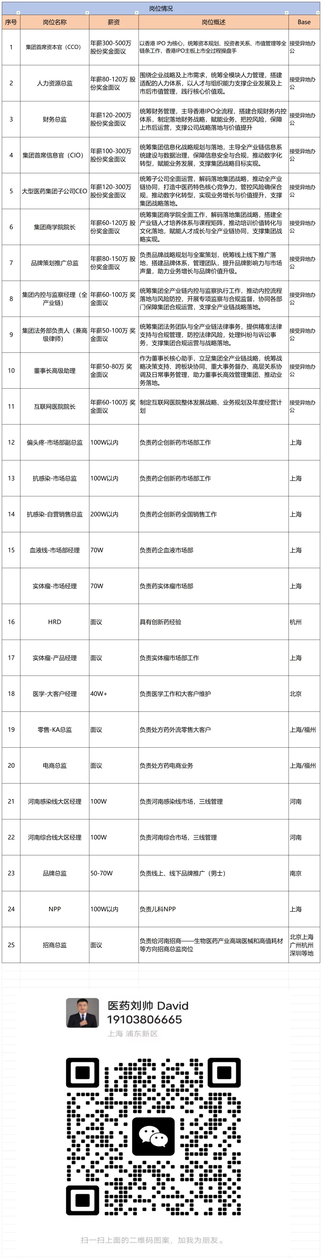 >猎头David的职位 | 首席资本官、药企CEO、互联网医院院长、HRD、市场总监、销售总监等