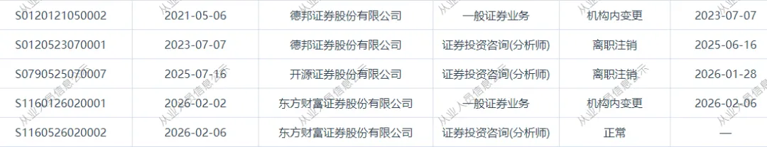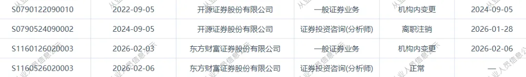 1、近日证券从业系统显示,朱佳琪,2月2日加入东方财富证券,2月6日变更为分析师,朱佳琪,原德邦证券分析师,25年7月份加入开源证券