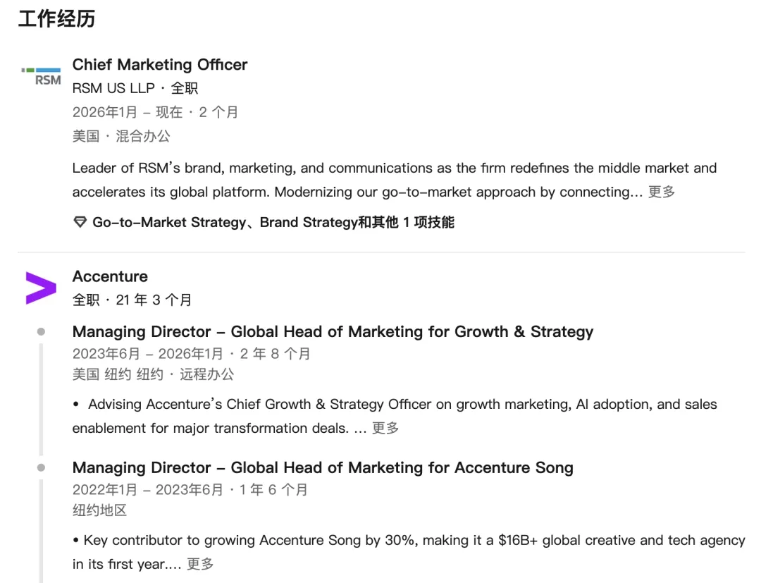 在此之前,他曾担任埃森哲消费品与制造业北美市场营销负责人,以及零售、消费品与旅游行业全球营销负责人。