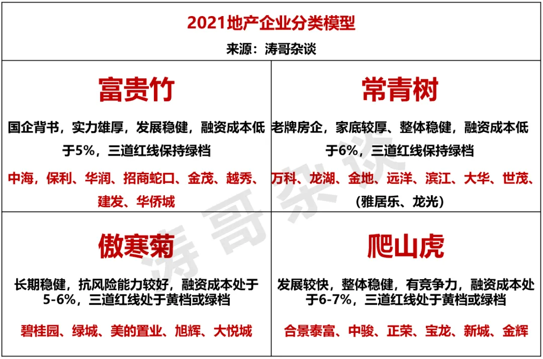 涛哥认为,三大红线指标中,绿档房企相对优质,黄档次之;融资成本表现中6%以内的非常优质,6-7%的次之;此外,国企背景也是重要的加分项。基于以上逻辑,我们将稳健型房企分为常青树、富贵竹、傲寒菊、爬山虎这4类,帮助大家判断。优势:国企背景,实力雄厚,发展稳健,融资成本低于5%,三道红线绿档。凭借国企身份加持,这类企业基本绝对不会出问题,适合追求长期稳定发展的人,同时工作生活也相对平衡。不足:薪酬在市场上处于中等分位,晋升速度一般,机会更多留给管培生或老员工,新进入社招人员可能发展较慢。典型:中海,保利、华润、招商蛇口、金茂、越秀、建发、华侨城优势:老牌房企,家底较厚,整体稳健,融资成本低于6%,三道红线绿档。这类企业兼顾了实力与市场化机制,相比纯国企更加灵活,晋升和发展机会也多一点,适合希望兼顾稳健与发展的地产人。不足:这类企业优势明显,但各自也存在一些缺点,例如万科薪酬低、龙湖加班多、世茂压力大等,选择前需要了解清楚。特别说明的是,雅居乐、龙光也符合低融资成本及绿档要求,但市场口碑一般,所以我们持保留意见。优势:长期稳健,抗风险能力较好,融资成本处于5-6%,三道红线处黄档或绿档。这类企业总体比较稳定,作为民营企业来说其财务基本面还算靠谱,可加入。不足:依然存在一定的市场压力,可能有一定范围的内部调整如区域合并等,同时人才也在升级。优势:发展较快,整体稳健,有竞争力,融资成本6-7%,三道红线处黄档或绿档。这类房企综合实力上当然不如前几种,但整体较稳健,比较市场化,薪酬还可以,适合大公司地产人跳过来获取更好的薪酬和晋升机会。不足:这类企业都有比较强的组织人才升级诉求,相对稳定性不够高,例如中骏今年已经做了好多次区域合并。3