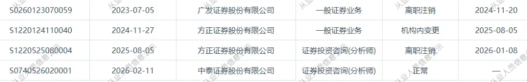 方正证券一首席分析师跳槽中泰证券