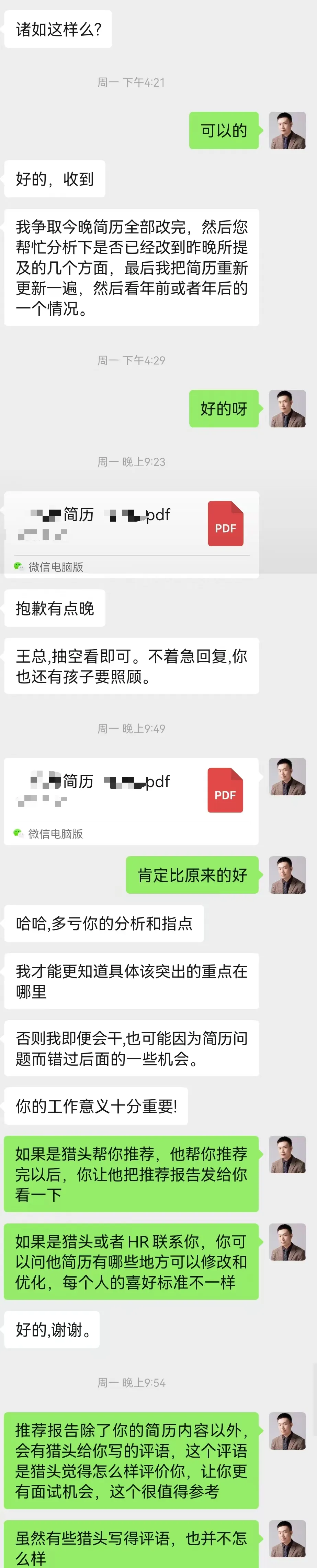 依晨刚开始的简历,写了4页,每一段的工作内容写得密密麻麻,却很空洞。首先,我要有个手机,其次要开机,再打开外卖APP,输入我想吃的东西的汉字......她的工作内容,写的都是非常通用的工作业务流程,做这个岗位的人,都是这样做的,不写都知道。而没写:她厉害的地方。1.简历的作用只有一个——让看简历的人觉得我和岗位合适,约我面试。3.筛选简历的时间是以秒为单位的,只写突出我和岗位匹配的内容,做过但不相关的一笔带过,或者不写,提高匹配“浓度”。她重新做了一份简历,看上去马上就不一样了,就好像原来我穿自己买的衣服,现在换成老婆帮我挑的穿搭。评论区互动:你跳槽的时候,是理性分析“为什么跳槽”多一点?还是情绪驱动“我想跳槽”多一点?你有后悔的“冲动跳槽”吗?你觉得简历最大的作用是什么?简历最难写的是什么?我是王锋,80后2娃爸,一个独立猎头,一个用心倾听的求职咨询师,一个分享真实猎头与求职故事的网友。找工作有困惑,可以找我聊:简历/面试/谈薪/offer/背调/竞业/离职/入职/试用期/转正/职业规划/求职心态/猎头相关