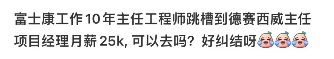 富士康工作10年主任工程师跳槽到德赛西威主任项目经理月薪25k,可以去吗?好纠结呀,这是这位工程师的困惑。