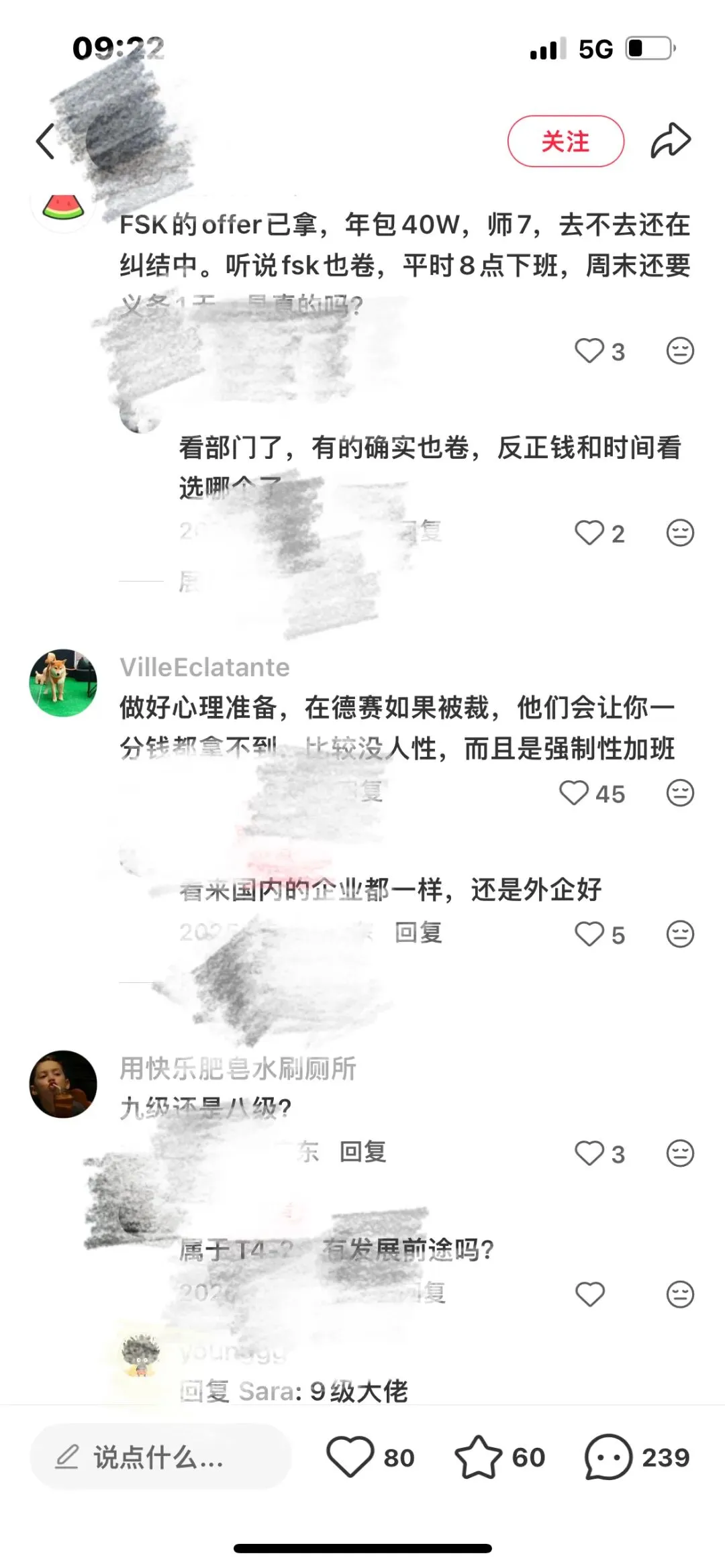 有人晒出自己拿到的FSK offer:年包40W,师7,去不去还在纠结中。听说fsk也卷,平时8点下班,周末还要义务1天,也有人回应“看部门了,有的确实也卷,反正钱和时间看选哪个了”。