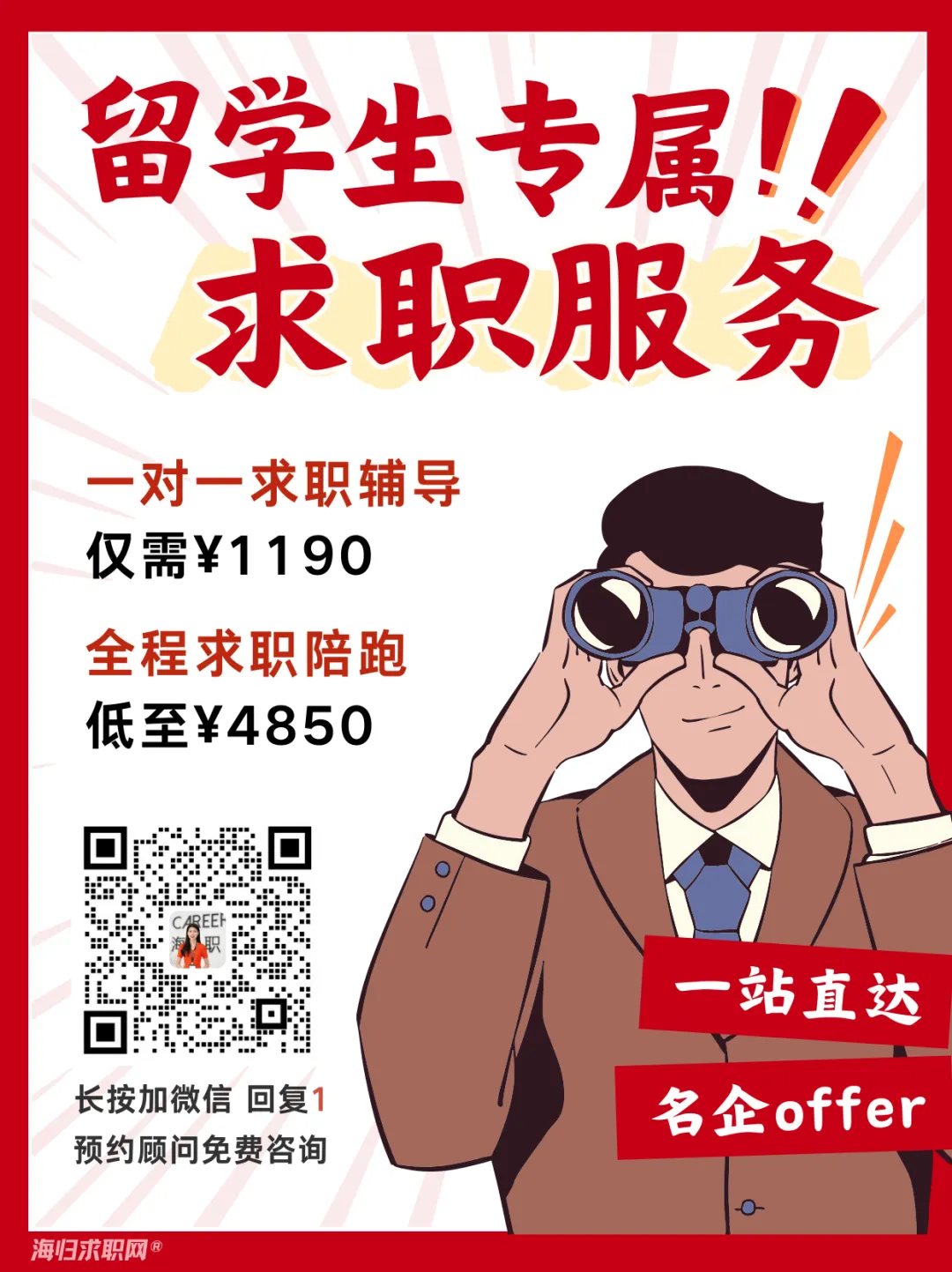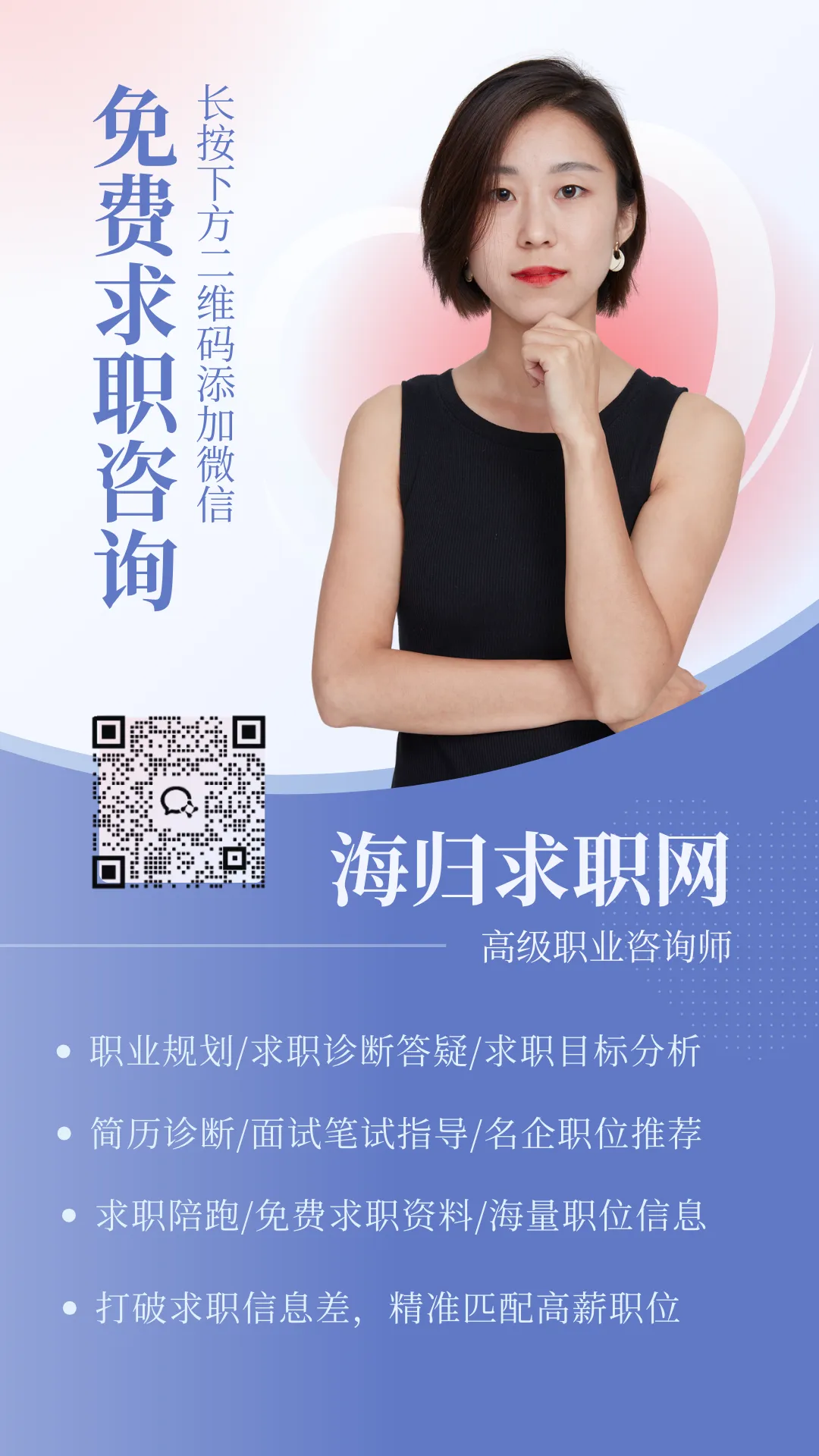长按下方二维码或添加微信(ID:1816631288 )预约海归求职网一对一专属求职顾问,定制专属求职方案!科学职业规划、简历本土化优化、面试模拟演练,帮你把‘留学优势’转化为‘求职胜势’!