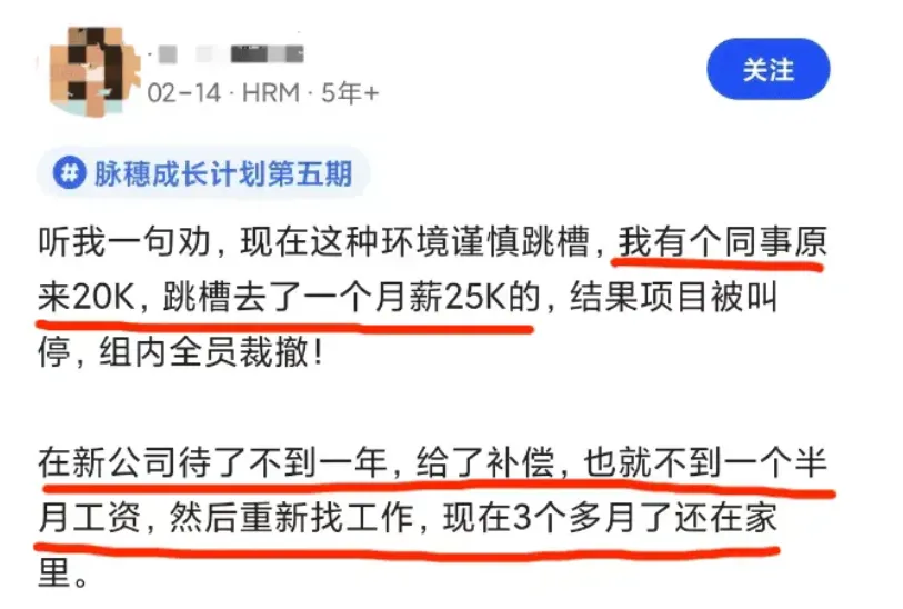 有网友便遇到了这样的事,他同事原来月薪20K,跳槽去了一家能给他25K的公司。结果刚报到一个月,新公司业务改革,他所在项目被叫停,组内全员被裁。