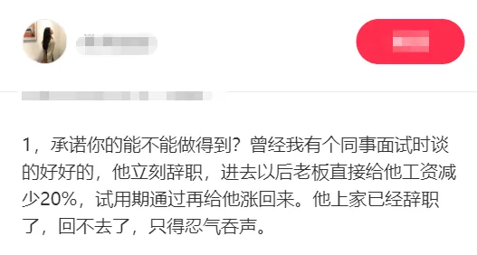 比如一位网友面试时谈的好好的,试用期拿全额工资,还缴纳五险一金,结果到新公司后老板直接给他工资减少20%,试用期通过再给他涨回来。