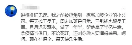 有网友表示这些都太真实了,自己之前被挖到新加坡的一个小企业就遇到过这些问题,公司非常斤斤计较,而且还会强制员工周末加班。自己过去帮公司签到5000W的大单,该有的提成奖励一个都没有,还被公司PUA要懂得感恩。