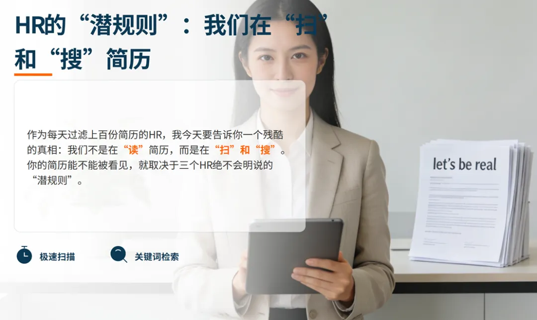 想象一下,HR打开招聘网站后台,面对上百份简历,他/她可能在用关键词进行初筛。你的简历如果没有出现那些“关键密语”,就会像隐形一样被跳过。