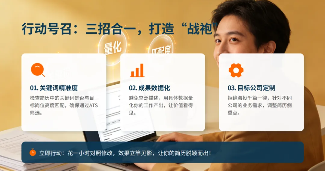 立刻行动:回顾你的每一段工作经历,为每一个职责,至少补充一个可量化的成果。可以是效率提升百分比、成本节约金额、用户增长数、项目完成速度、管理团队规模、客户满意度得分等。