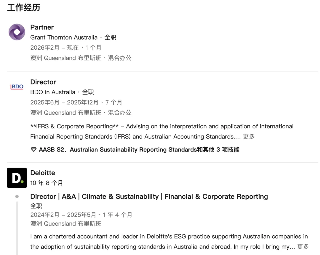 Grant Thornton ESG 与可持续发展服务主管 Andrew Rigele 表示:“我们非常高兴迎来像 Elna 这样优秀的人才。她兼具专业服务与企业经验,拥有深厚的技术能力,并深刻理解可持续发展报告与财务报告的融合方式。随着澳大利亚可持续发展报告框架不断演进,她的领导力与经验将帮助我们更好地支持客户。”