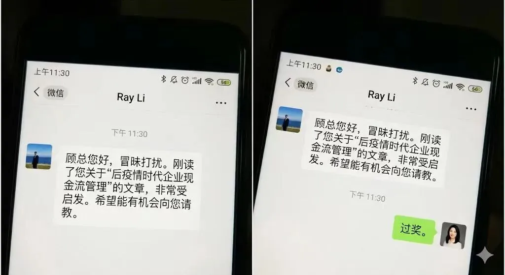 “顾总您好,冒昧打扰。刚读了您关于‘后疫情时代企业现金流管理’的文章,非常受启发。特别是您提到的‘弹性冗余’概念,让我想起我08年在硅谷处理危机时的经历。希望能有机会向您请教。”