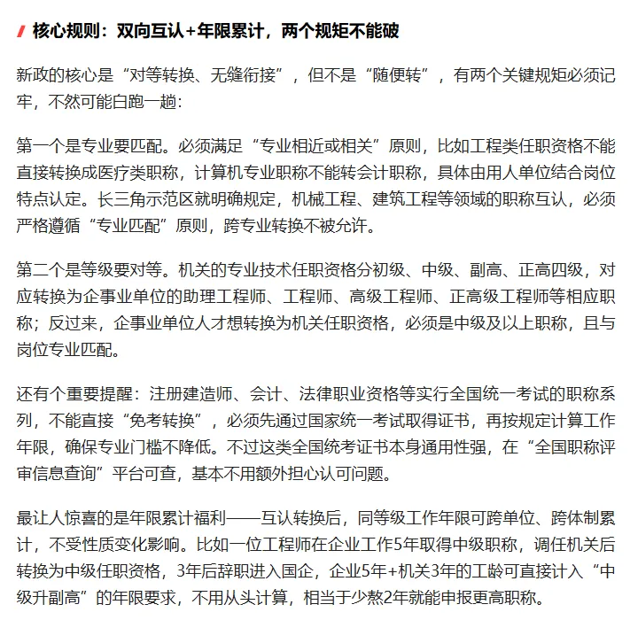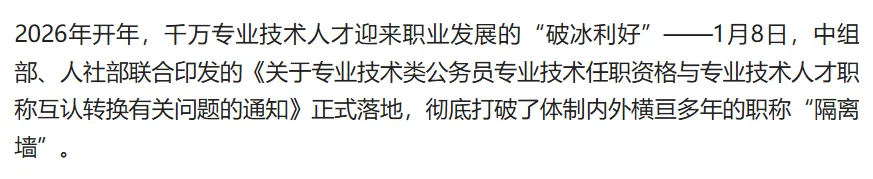 温馨提示:本文基于中组部、人社部《关于专业技术类公务员专业技术任职资格与专业技术人才职称互认转换有关问题的通知》及京津冀、川渝、长三角等地公开试点案例、执行细则整理,仅为个人观点,仅供参考。职称互认的具体适用范围、转换标准、办理流程等,以当地人社部门发布的最新政策文件为准,如有疑问可拨打全国人社服务热线12333,或咨询单位人事部门、当地人社厅职称经办窗口获取专业解答。