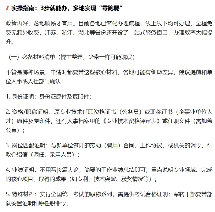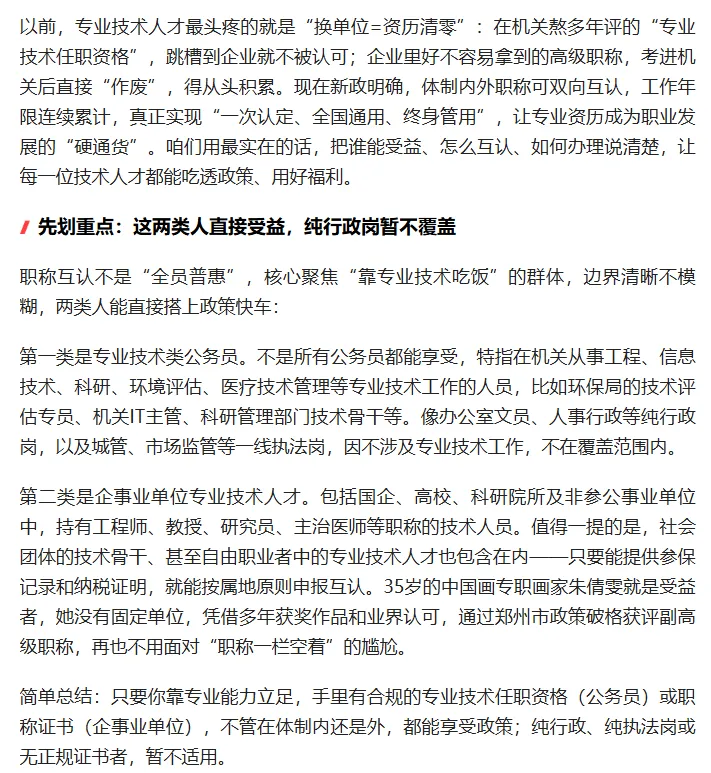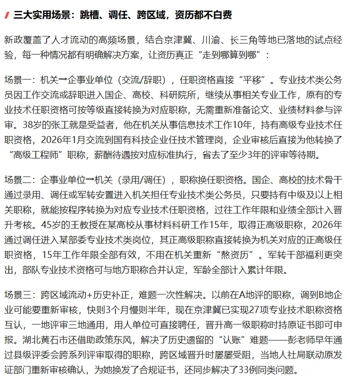 这不仅能激发人才流动活力,让专业技术人才不再被“身份”绑架,更能促进优质人才资源在机关、企业、高校间合理配置,为创新发展注入动力。对个人来说,职称和资历不再受单位性质限制,职业选择更自由;对企业和机关来说,能更便捷地引进优质人才,减少人才培养成本,实现双赢。
