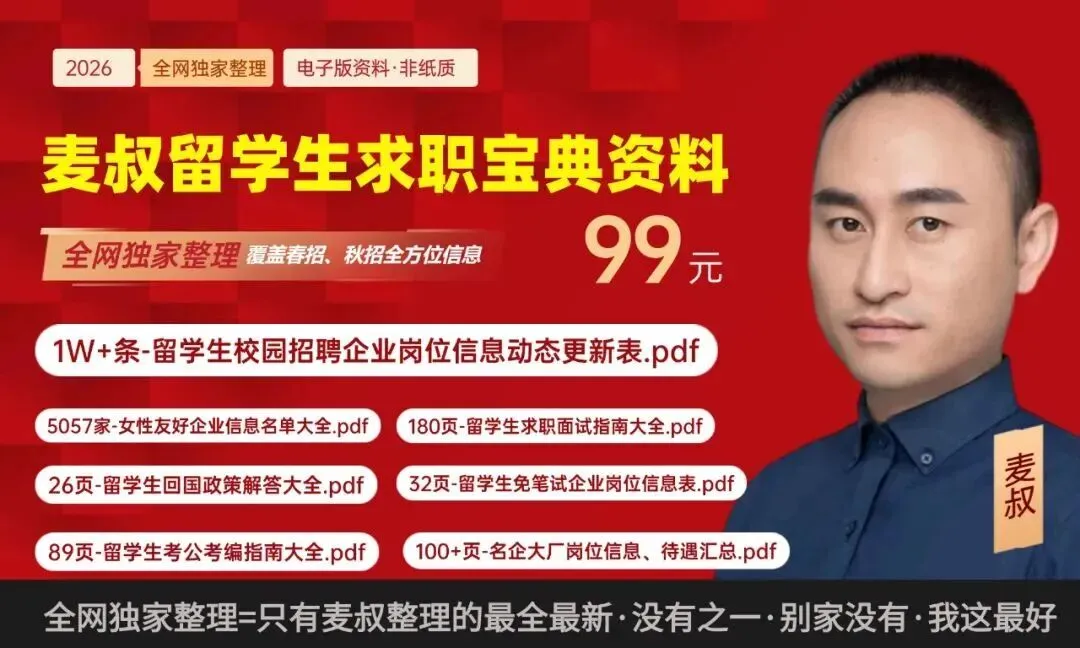 麦叔熬夜整理的全网独家《2026年留学生求职宝典系列资料》(内含各地最新落户、企业招聘、企业薪资福利等各类具体要求)。