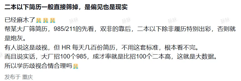 但也有不同的声音出现,有人替大厂和HR辩解,坦言这并非单纯的歧视,而是现实所迫——HR每天要处理几百份甚至上千份简历,若是没有一套高效的筛选标准,根本看不完,也难以快速筛选出合适的候选人。