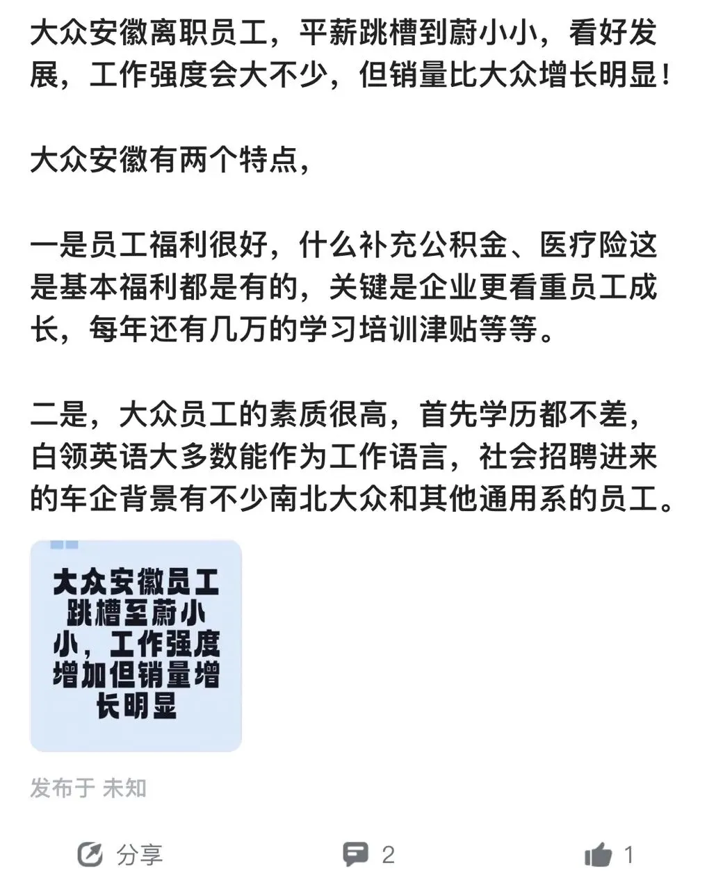 最近刷到一位大众安徽离职员工的分享,他平薪跳槽到了蔚小小,明明大众的福利和员工素质都很亮眼,却还是选择了工作强度更大的新平台,背后的考量,戳中了很多职场人的真实心态。