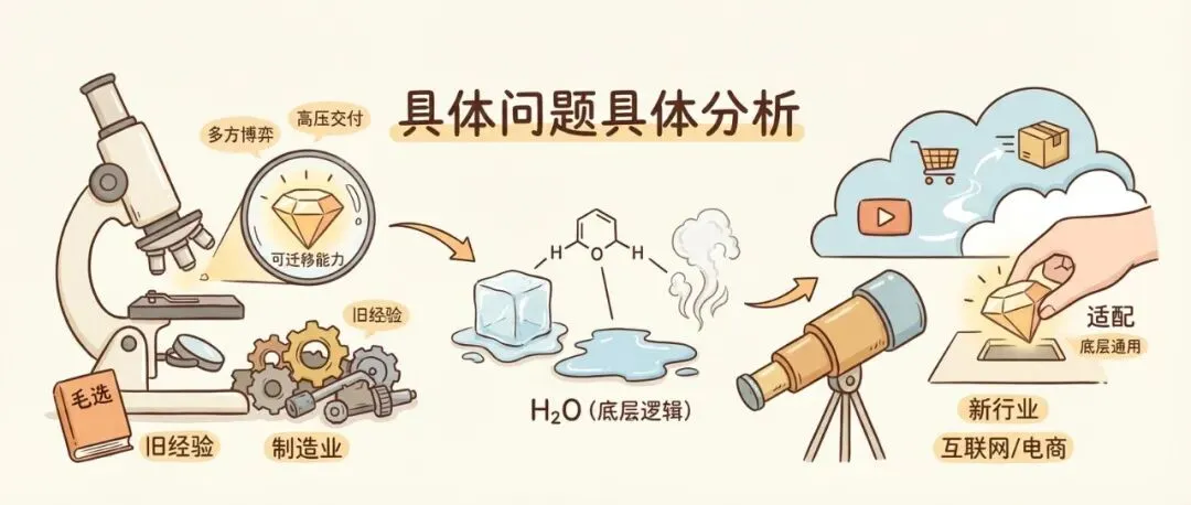 看懂了吗?“零部件”是特殊的,但“多方博弈”是通用的;“停机率”是特殊的,但“高压环境下的交付能力”是通用的。这就是可迁移能力。它像水一样,在制造业是冰,在互联网是气,形态变了,H2O的化学式没变。