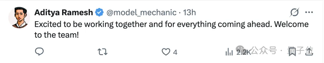 OpenAI世界模拟方向的负责人之一、Sora项目资深领导Aditya Ramesh也第一时间留言欢迎。