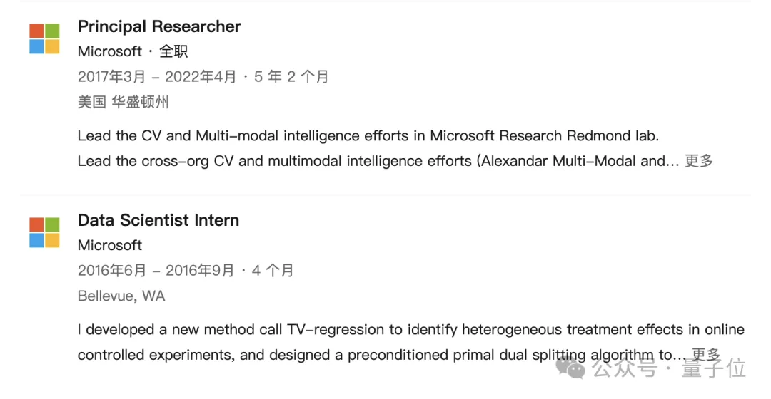 同时还在微软内部跨组织推动计算机视觉与多模态智能项目,包括Alexandar Multi-Modal和Florence等方向。