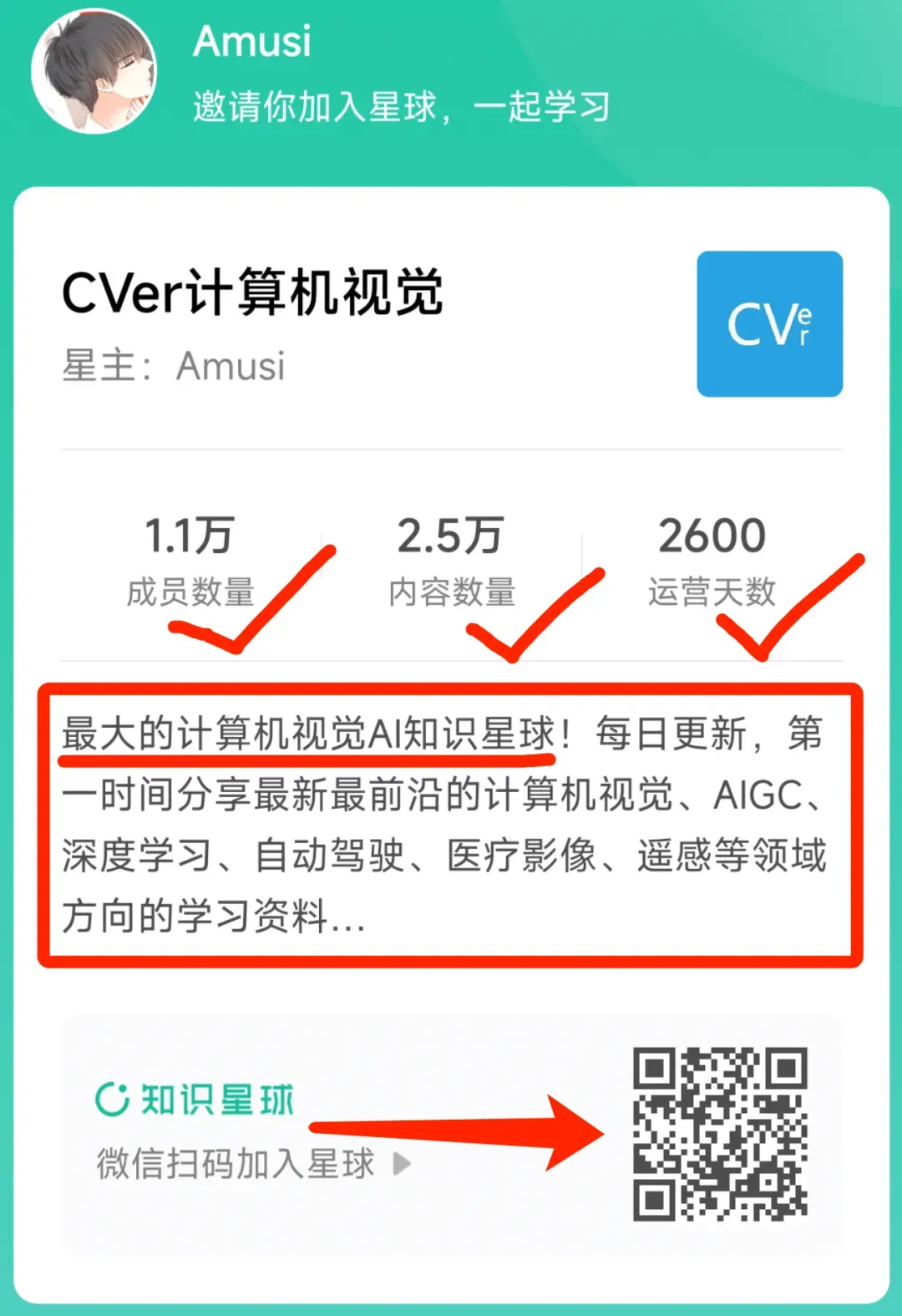 扫描下方二维码,加入CVer学术星球!可以获得最新顶会/顶刊上的论文idea和CV从入门到精通资料及应用!发论文/搞科研/涨薪,强烈推荐!