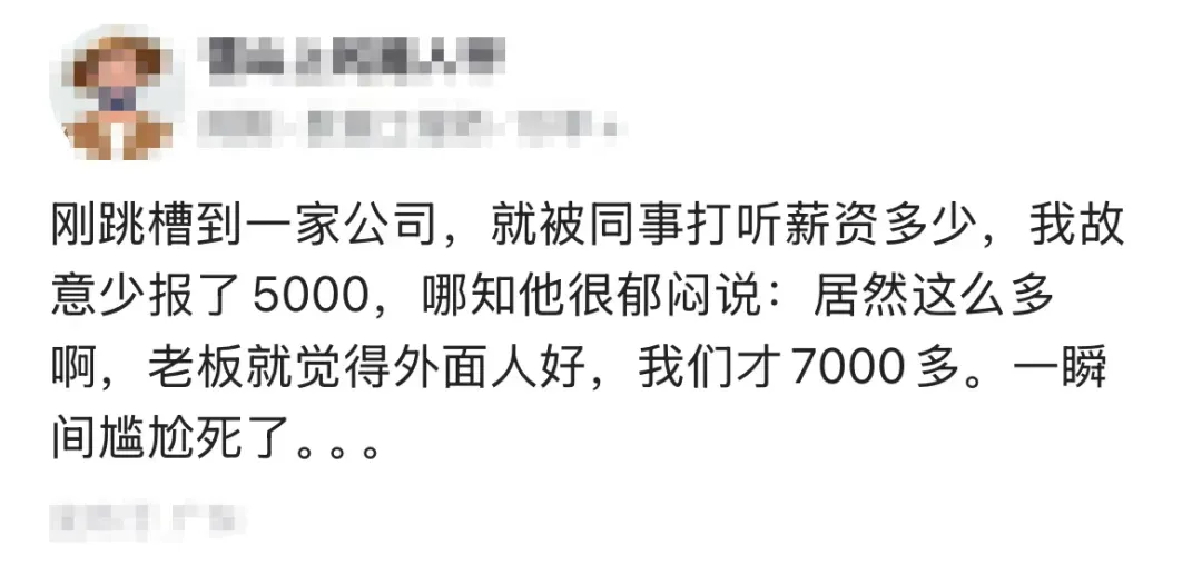 刚跳槽到一家公司,就被同事打听薪资多少,我故意少报了 5000,哪知他说:居然这么多啊,老板就觉得外面人好,我们才7000多