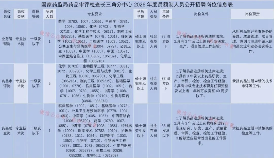 社会在职人员。有关工作年限要求,计算截止时间为2026年1月。具体招聘人数和岗位要求见《国家药监局药品审评检查长三角分中心2026年度员额制人员公开招聘岗位信息表》(详见附件)。