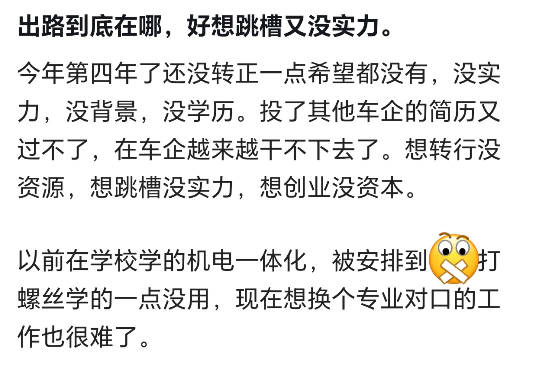 【汽车行业越来越卷,卷的有点快卷不动了,这让之前因为没学历加入汽车行业的大佬更为犯难,想跳确没有太多可以选择的机会,真的是三无人员,没背景,没学历,没实力,出路在哪里呢】
