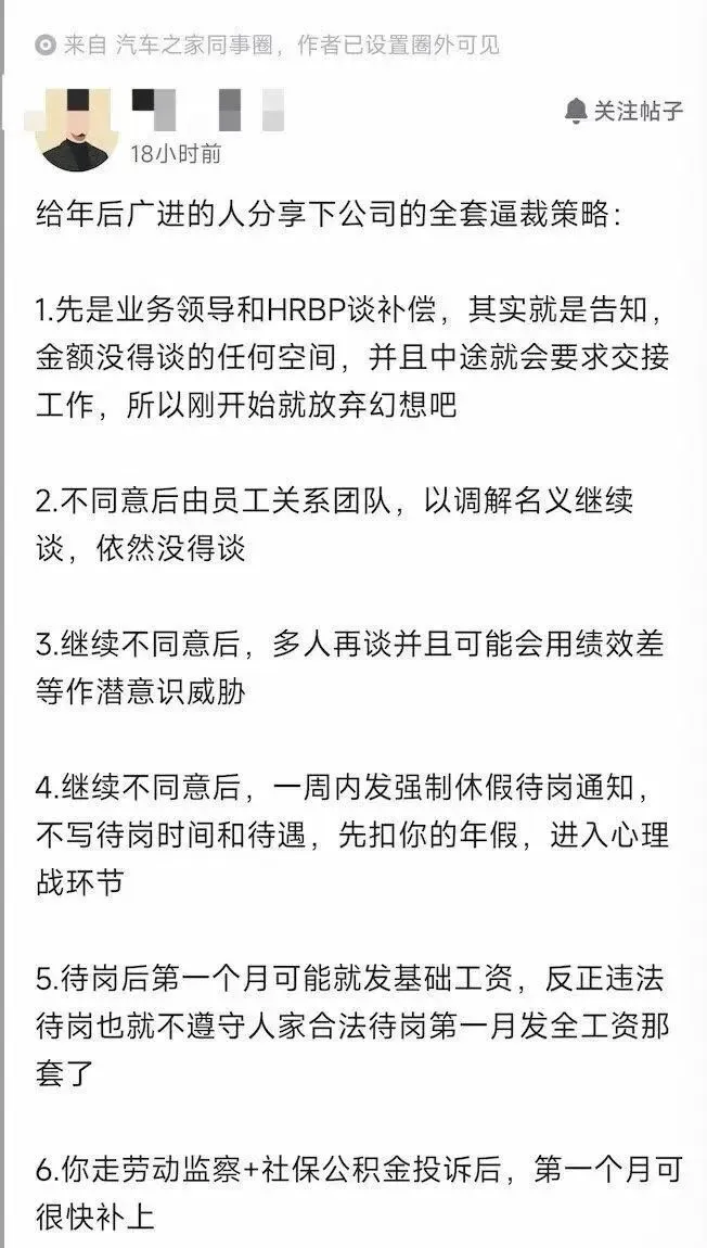 今天知予在脉脉上刷到一位来自汽车之家同事圈的吐槽:把公司逼员工走的“逼裁六步法”,写得明明白白、一丝不挂。知予也在这给打算往汽车之家跳的兄弟姐妹们提个醒,先看完这个,再决定要不要投简历,别稀里糊涂踩坑!