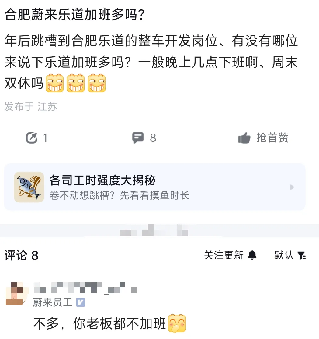 >蔚来汽车员工爆料:年后跳槽到合肥乐道的整车开发岗位、有没有哪位来说下乐道加班多吗?一般晚上几点下班啊、周末双休吗?