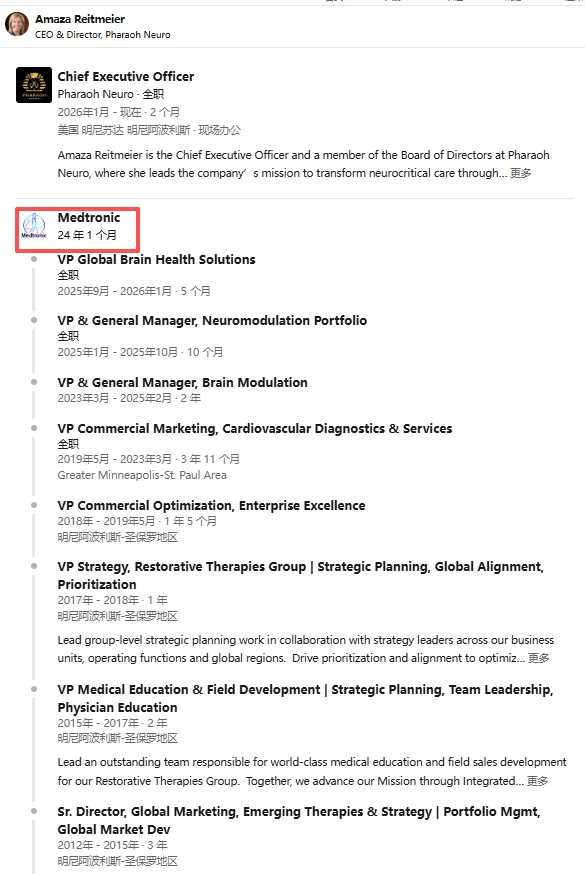 Amaza Reitmeier拥有超过20年的全球医疗科技领导经验,此前在美敦力担任神经调控业务部门副总裁兼总经理。在这个岗位上,她负责这家医疗科技巨头复杂的神经技术业务,并成功领导了多项创新技术的引进和商业化推广。