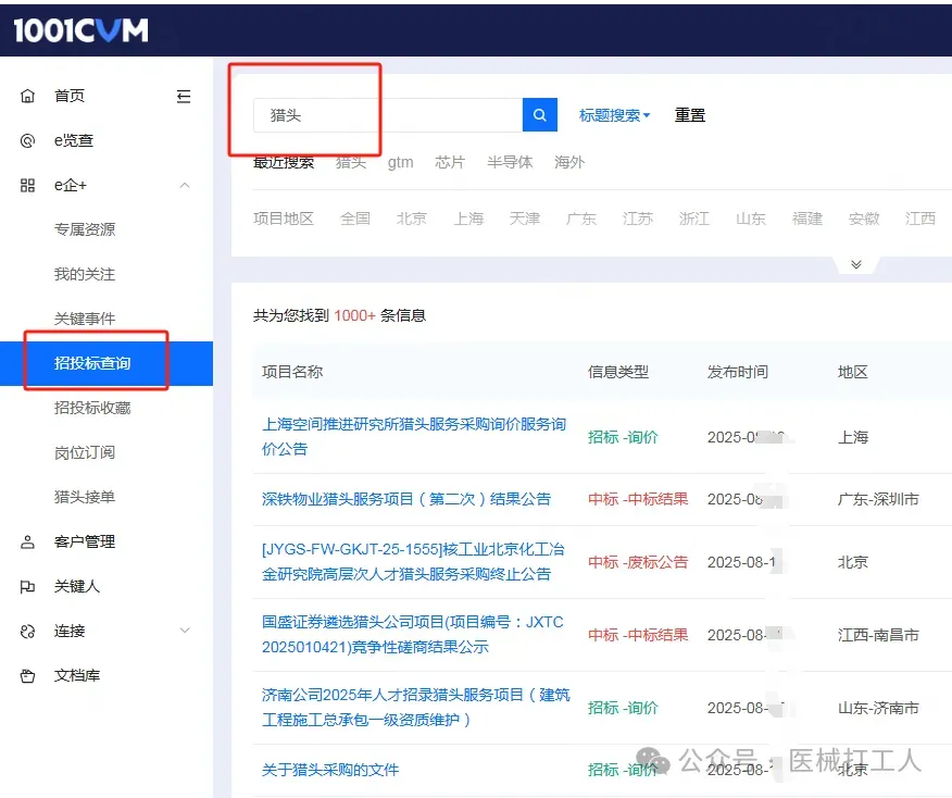 平台项目不够选?自己找!集成海量企业信用信息、猎头公开招投标信息,助你精准锁定目标客户。内置客户管理系统,让你轻松跟进潜在客户,把握每一个商机。自主BD利器,助你突破项目来源瓶颈!