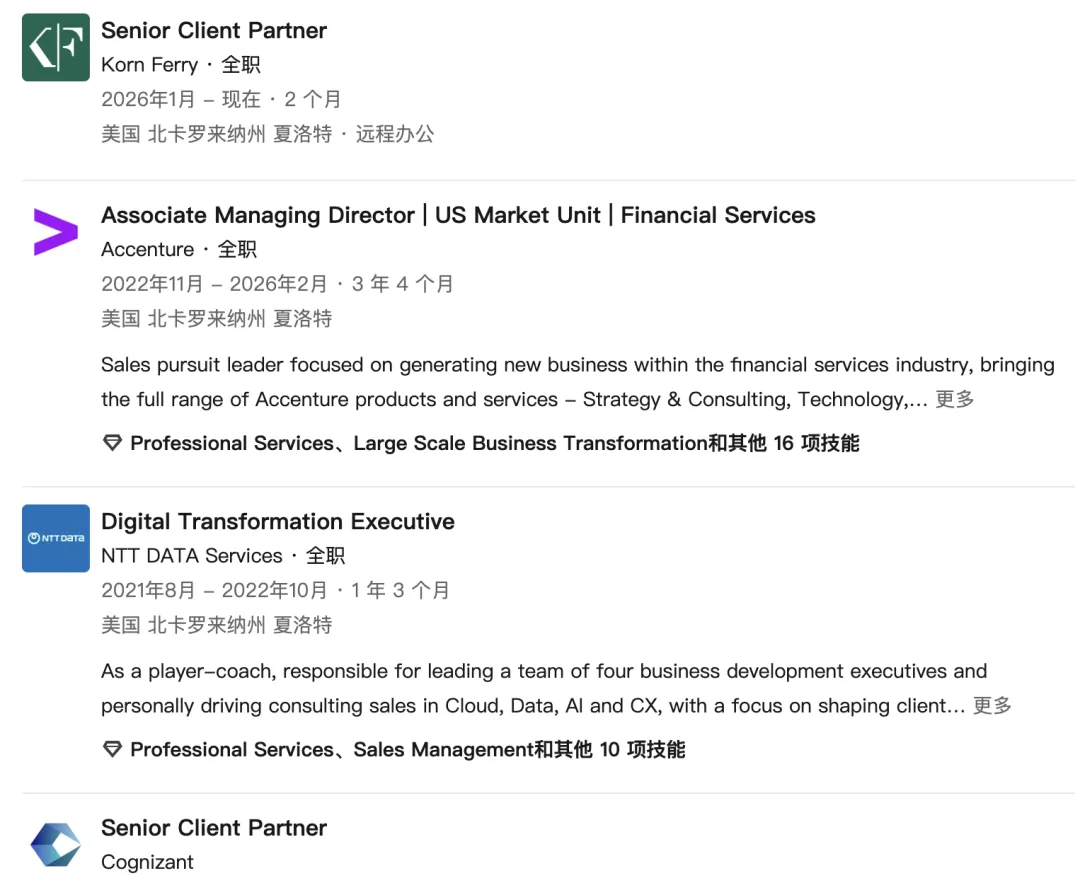 他此前曾担任埃森哲副董事总经理、NTT Data Services数字化转型高管,以及高知特(Cognizant)高级客户合伙人。