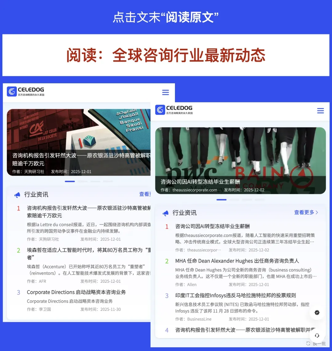 天狗研习社是中国面向咨询行业的专业资讯智能平台,7x24小时传播全球咨询实时新闻、咨询项目招投标公告、各大咨询公司和研究机构的报告发布/精读、知名企业管理实践分享、资深咨询顾问的专业文章。欢迎点击“阅读原文”进入天狗研习社平台。