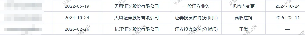 近日证券从业系统显示,黄建霖,2月26日加入长江证券,黄建霖,天风证券农业高级分析师