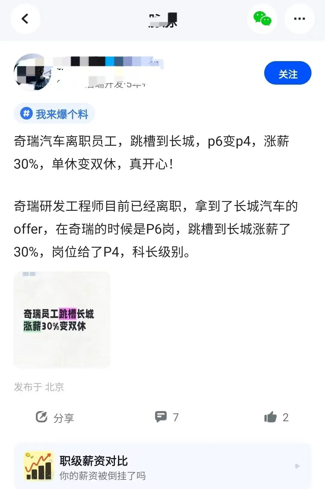 最近两个月,车企跳槽帖里有一类特别“爽”的关键词不是福利本身,而是“涨薪+职级+双休”同时拿到。全球AI资讯君看到:一位奇瑞汽车研发工程师已离职,拿到长城汽车offer;在奇瑞是P6,跳到长城给到P4(科长级别),涨薪30%,最开心的是——单休变双休。