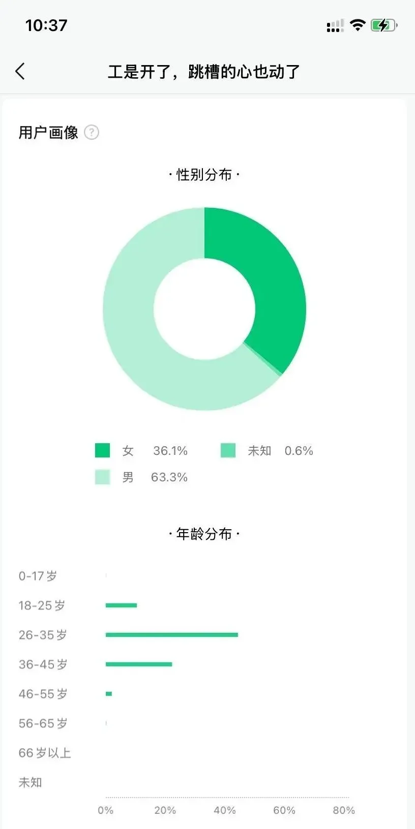 男性读者占比63%,女性36%。将近两倍的差距。是男性跳槽意愿更强?还是女性对这类话题更谨慎?数据不会说话,但它确实划出了一道清晰的性别分界线。