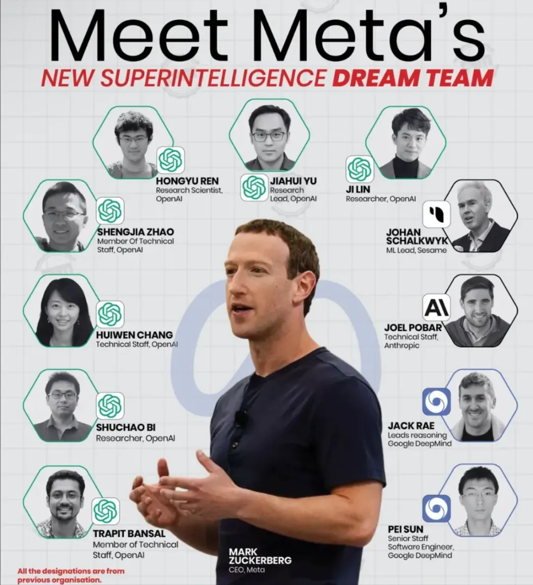 那时候的Meta AI团队,堪称一支“华人梦之队”:中科大本科UIUC博士余家辉、清华本科斯坦福博士赵晟佳、浙大本科伯克利博士毕树超、北大本科斯坦福博士任泓宇……扎克伯格几乎是拿着支票本,把全球顶尖的华人AI博士挨个“扫货”进了自家实验室。