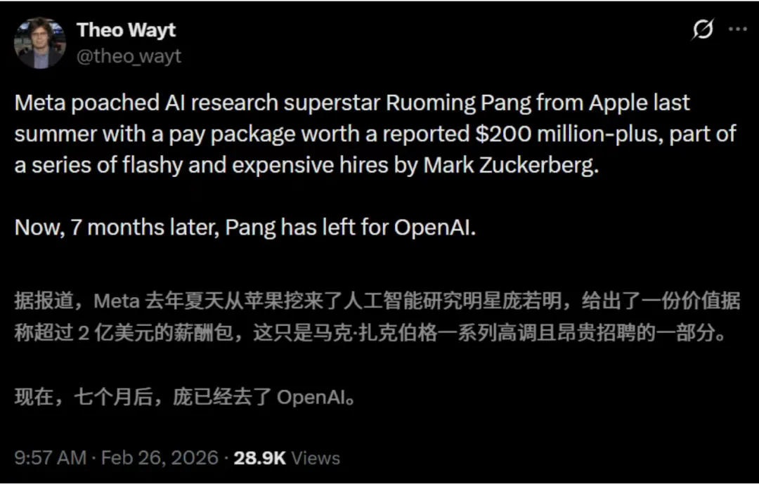 可现实是,哪怕是这样的“天价砸”,也留不住顶尖人才的脚步。庞若鸣曾告诉同事,「自己在Meta工作得非常愉快,且公司基础设施建设已步入正轨」。可同事没想到,庞若鸣前脚刚说完,后脚就转身去了OpenAI。