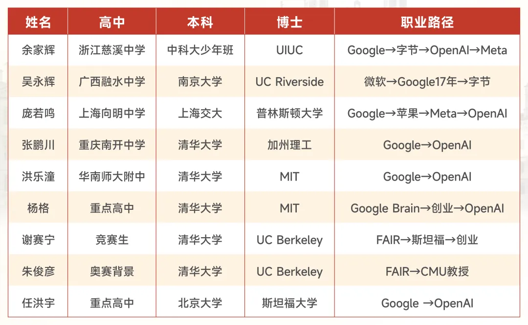 ⚠️ 国内知名高中打底 → 竞赛强基加持 → 清北/交大/南大/中科大/浙大本科 → 北美顶尖博士深造 → 最终在谷歌、Meta、OpenAI、微软、英伟达这类巨头里,完成从“学霸”到“工程师”的蜕变。