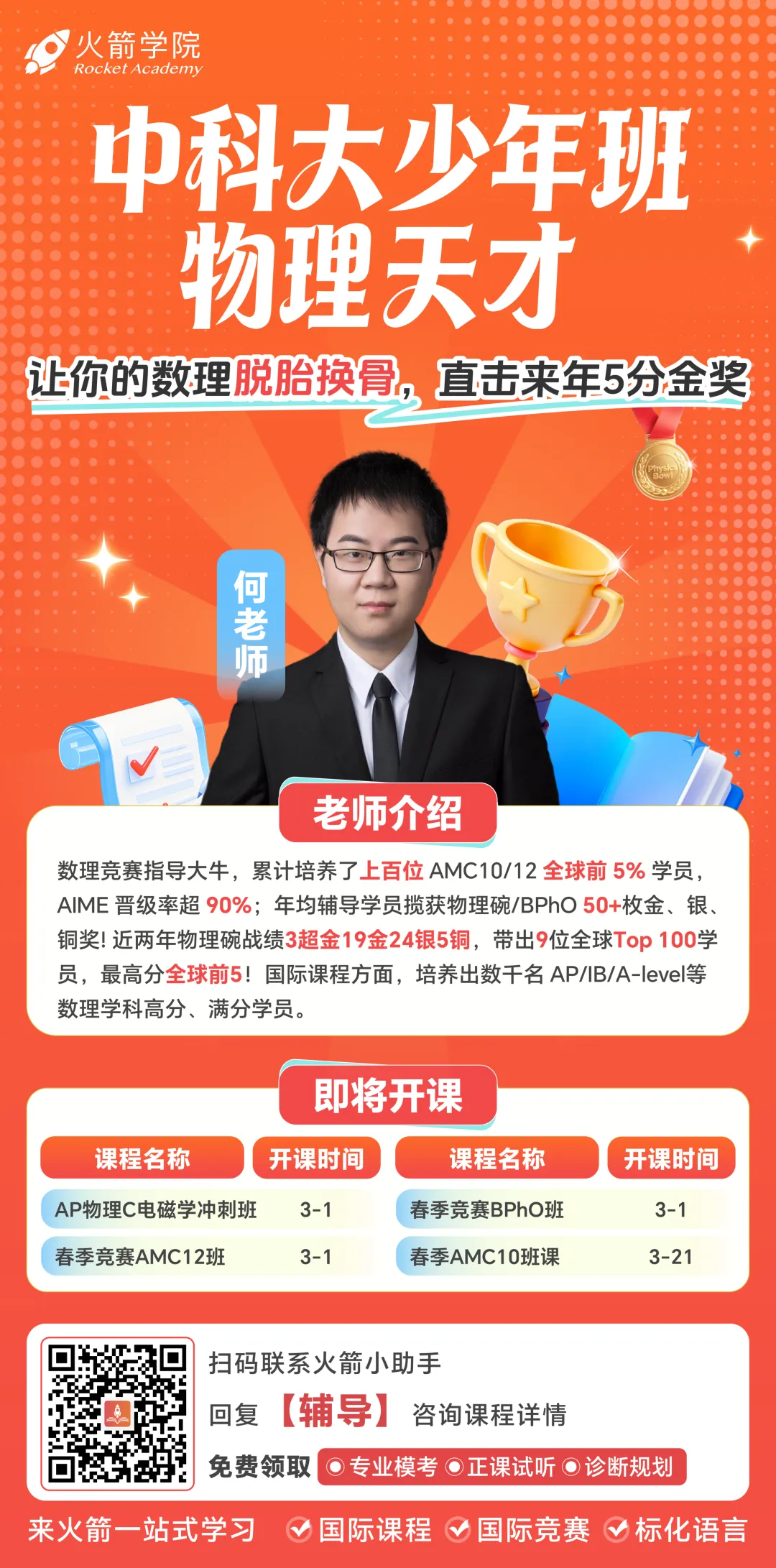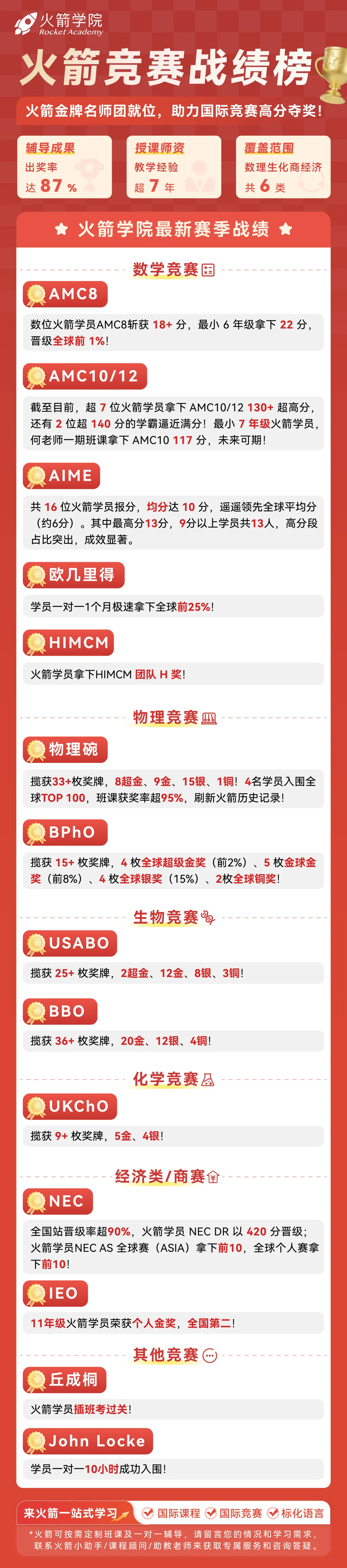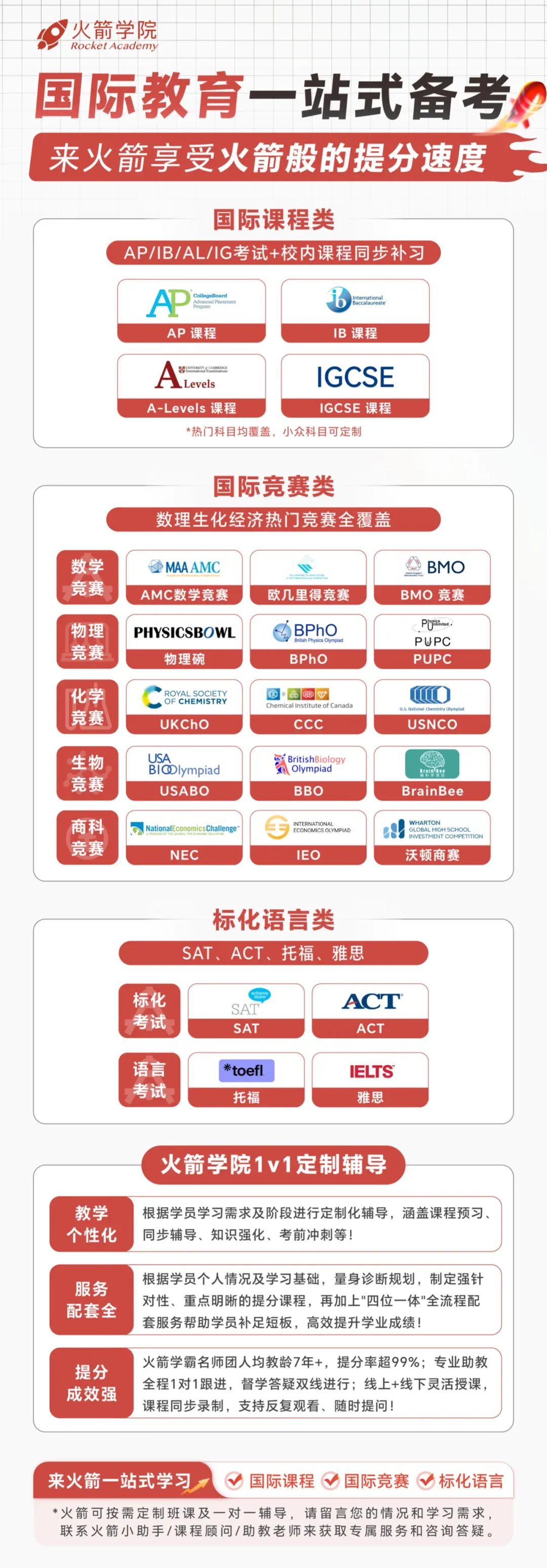 📢 火箭学院的“一站式”课程可以陪伴你从课业规划(校内补习)、标化语言、国际竞赛到国际课程,每年的战绩就是专业度最好的证明!快来报名课程吧👇