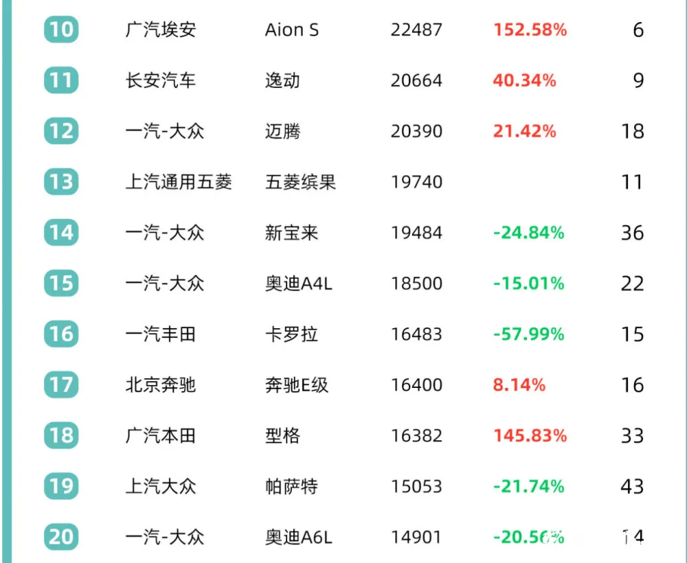 在搜狐汽车研究室根据乘联会数据统计发布的6月轿车销量排名10至20名中,卡罗拉比上月又下行一位