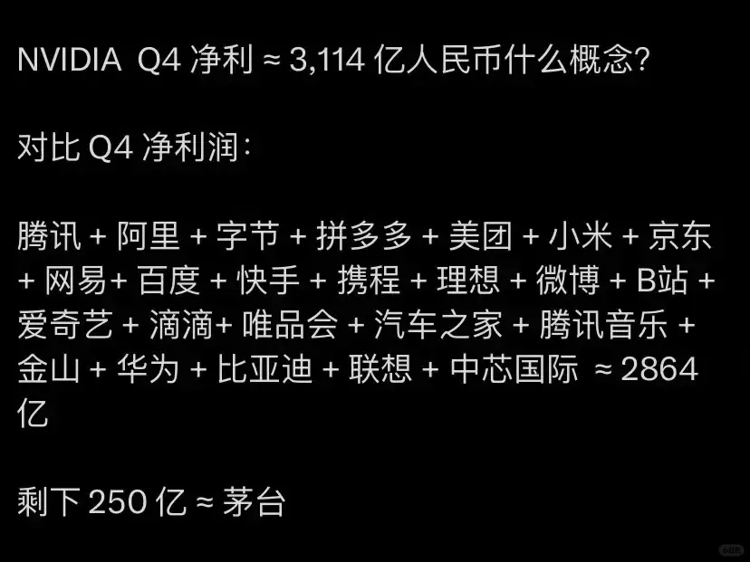 更有网友计算,英伟达Q4季度净利=内地所有头部互联网科技企业+茅台利润总和。