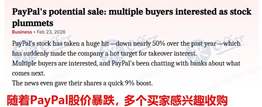 就在股价颓势难止之际,有报道称,PayPal已被摆上“货架”,多家潜在买家正表达收购兴趣,关于公司的出售谈判或已在暗中推进。