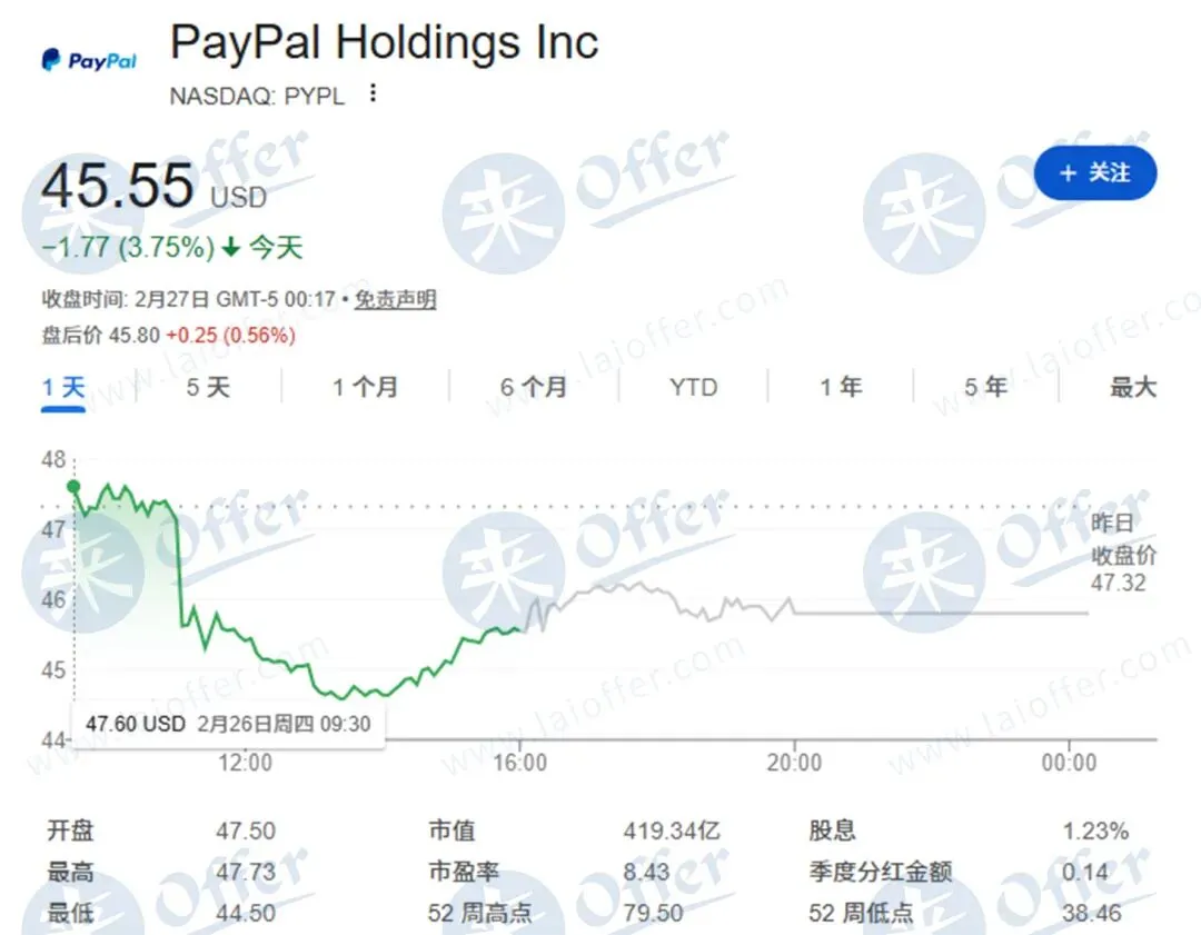 近十二个月来,PayPal股价一路下探,跌幅超46%,股价仅为45.5 美元,昔日支付巨头的光环正逐渐褪去。