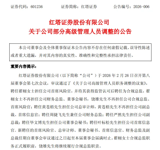马年开局第一周,红塔证券对高层进行较大范围调整,涉及到财务总监、董秘、副总裁和多位“首席”。