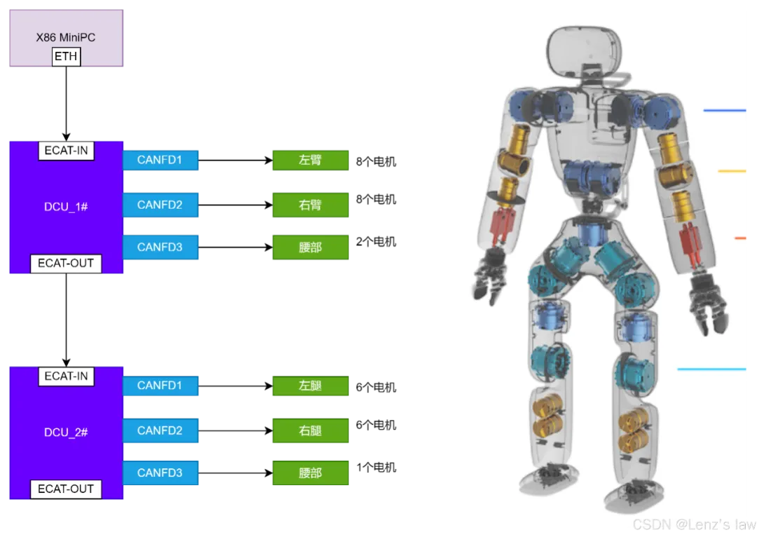 这里面有两个DCU,即域控制器也有叫分布式控制单元,与汽车行业的域控制器很像,这个域控制器主要是连接英特尔的迷你PC和身体各关节的电机,每个DCU输出三路CAN-FD,如果要求实时性很高,那要升级为EtherCAT。