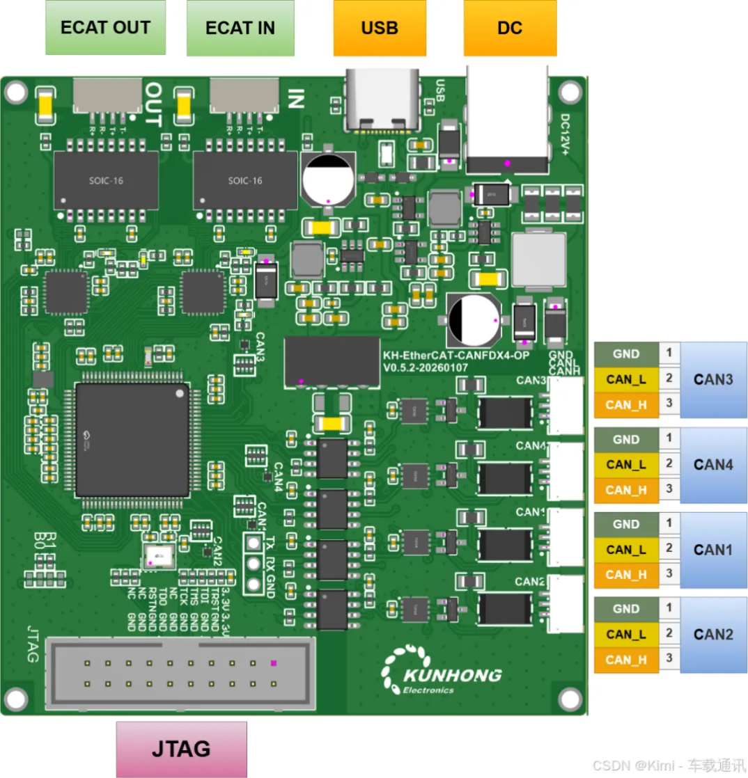 DCU其实主要功能就是EtherCAT转3路CANFD。X86 MiniPC通过EtherCAT主站协议,封装CAN-FD数据帧成PDO进行传输,发送给DCU模块,DCU解析后拆分出三路CAN-FD的报文数据再转发给执行器。CAN-FD 通讯参数,仲裁域波特率 1M,采样点80%,数据域波特率5M,采样点75%。数据转发频率1KHz,可推测关键电机的控制频率为1KHz,电机采用CAN-FD 64字节打包控制协议,其中有广播模式,指的是用CAN-FD 64字节的长帧,包含8个电机的控制命令,一帧发出去同时控制8个电机。8个电机可同时收到控制命令,提升同步性CAN-FD只有数据域是采用5M高波特率,但是ID(仲裁段)还是用的1M,尽可能的利用CAN-FD的64字节长数据帧,可以减少仲裁段在通讯中的占比,最大化提升总线带宽利用,发挥CAN-FD加速的优势。当前已经有更好的CAN-FD多路扩展方案,有的6路CAN-FD扩展板,体积甚至可以做到4*5cm大小,远比灵犀X1的DCU小的多。
